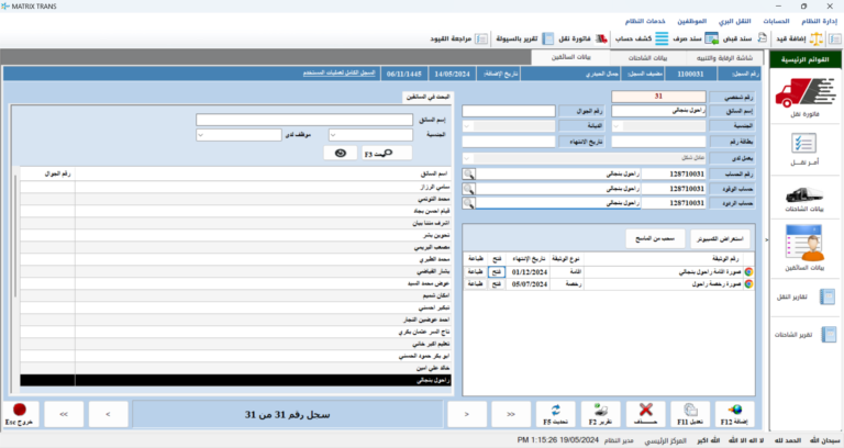 *حفظ ومتابعة حسابات السائقين ومستحقاتهم من مصاريف الرحلات وغيرها من خلال كشوفات حسابية وتقارير تشغيلية.