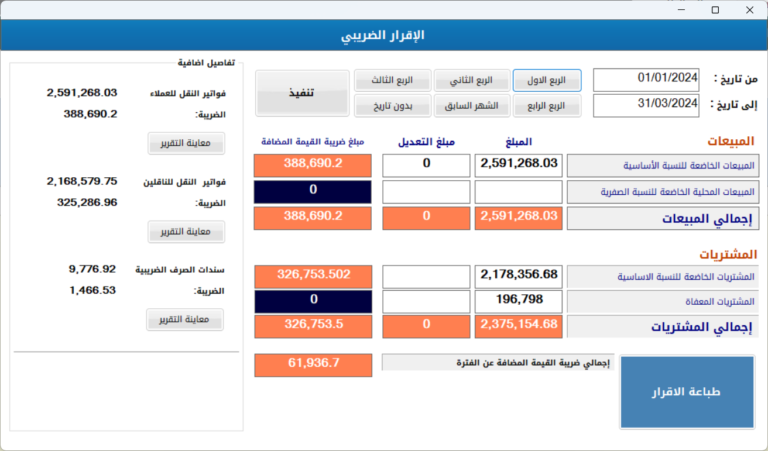 *حساب الضريبة المضافة واستخراج إقرار ضريبي لفترة زمنية بمجرد ضغطة زر