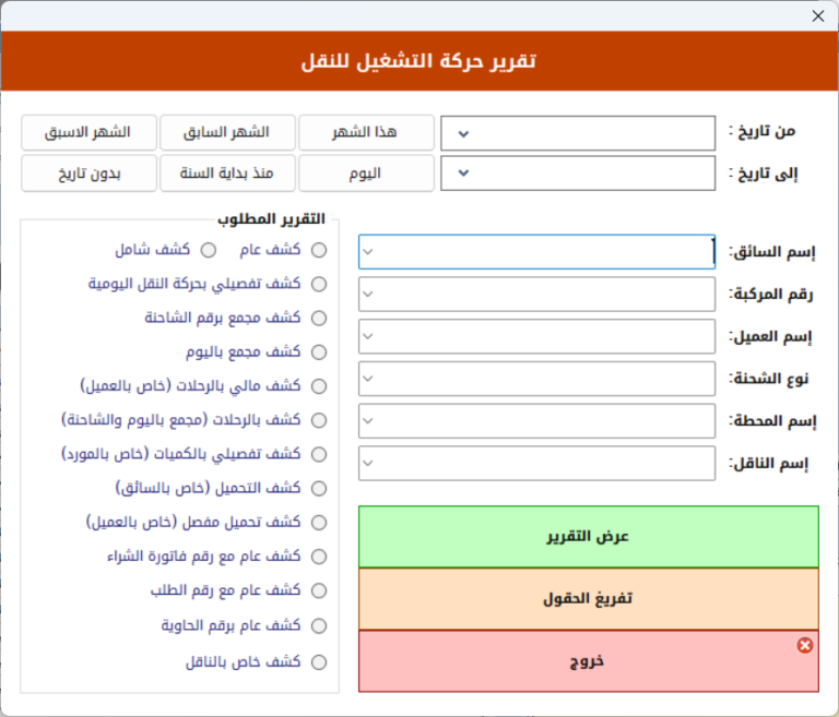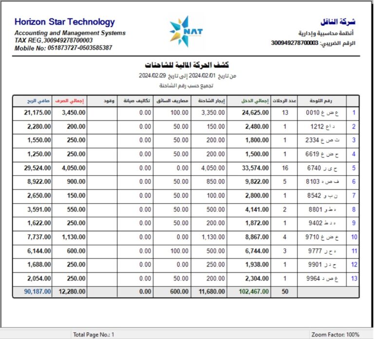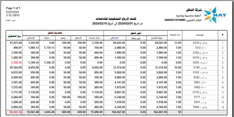 *تقارير تشغيلية توضح حجم الإيرادات والمصروفات لكل شاحنة بشكل تفصيلي او اجمالي